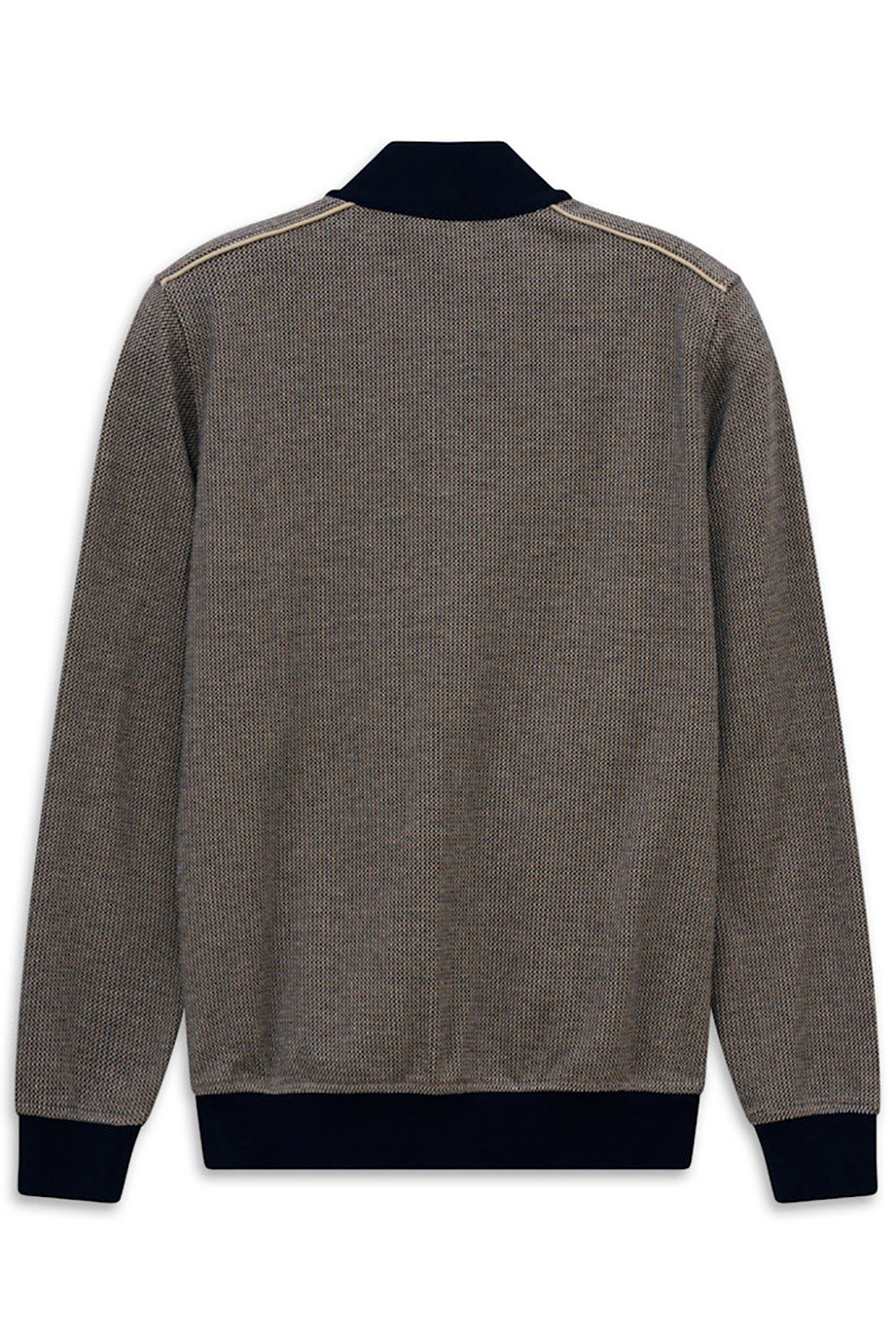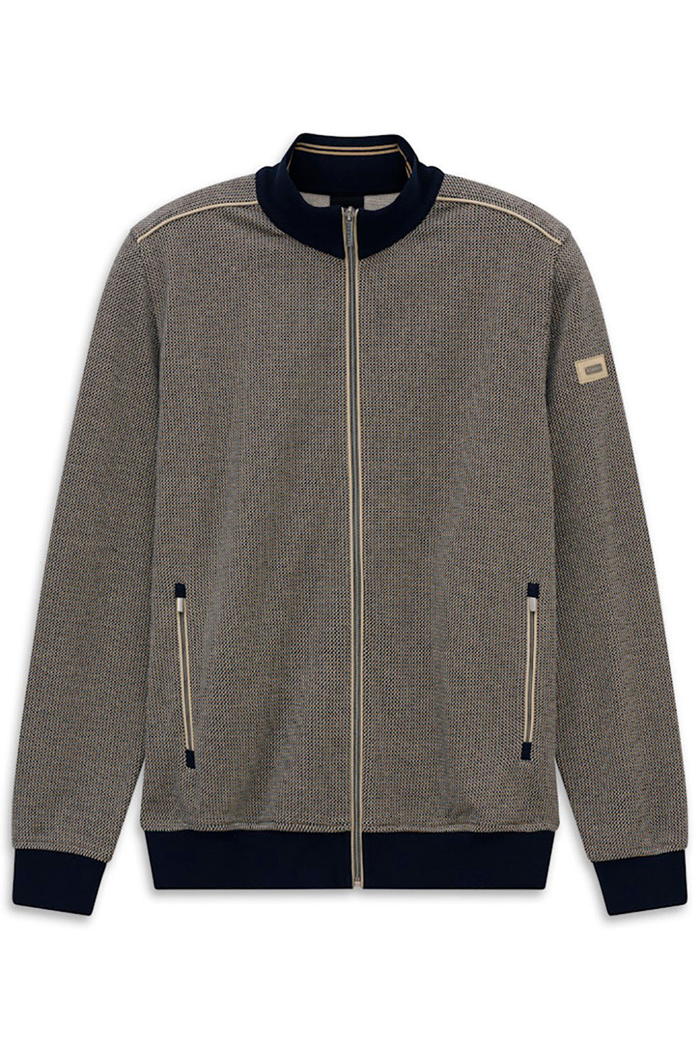 This Bugatti men's knit jacket in a modern fit combines an elegant jacquard pattern with exceptional comfort. The cotton-polyester blend ensures a comfortable fit. It features colorful accents and is equipped with a stand-up collar, zipper, and practical zip pockets, making it ideal for leisure and everyday wear.