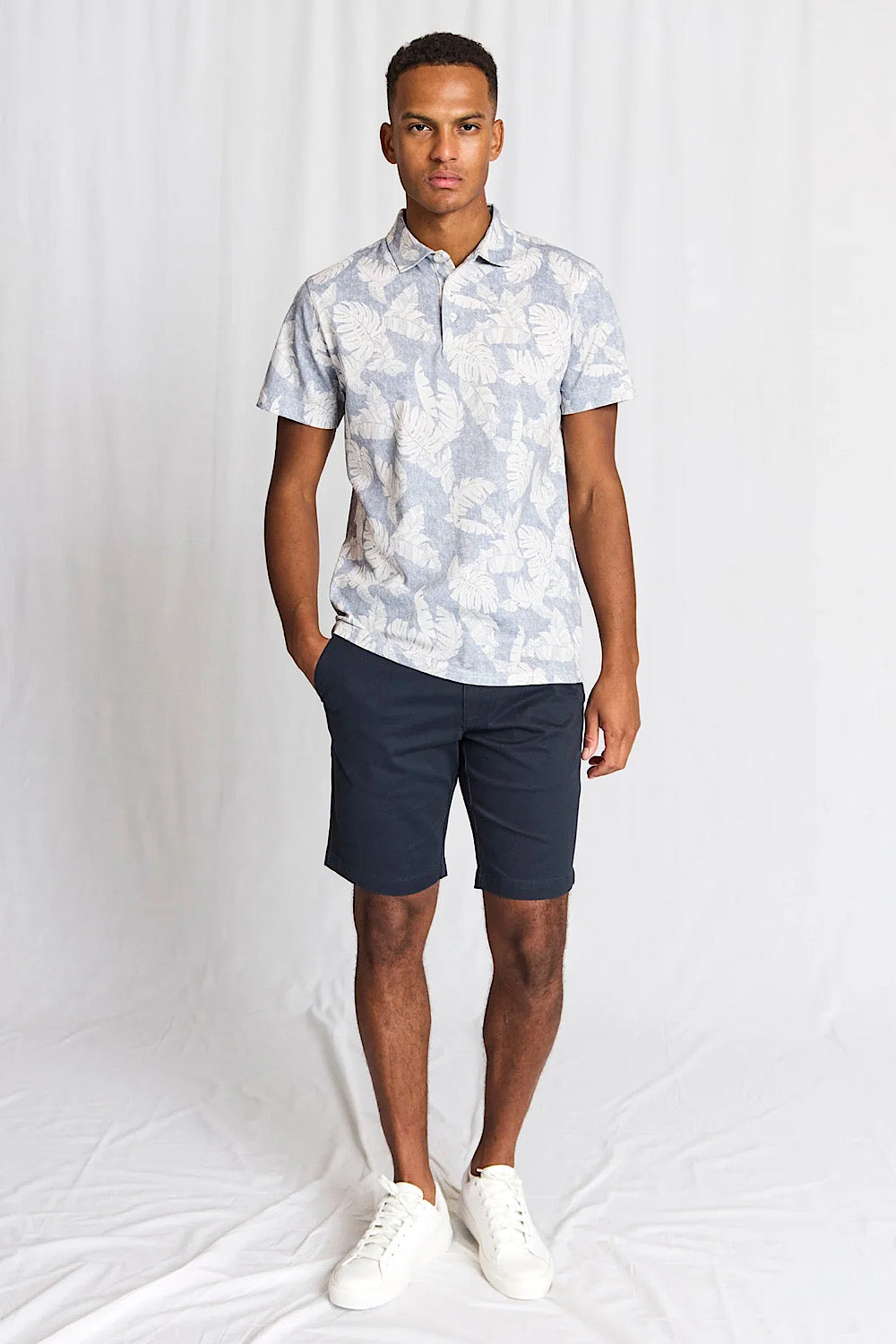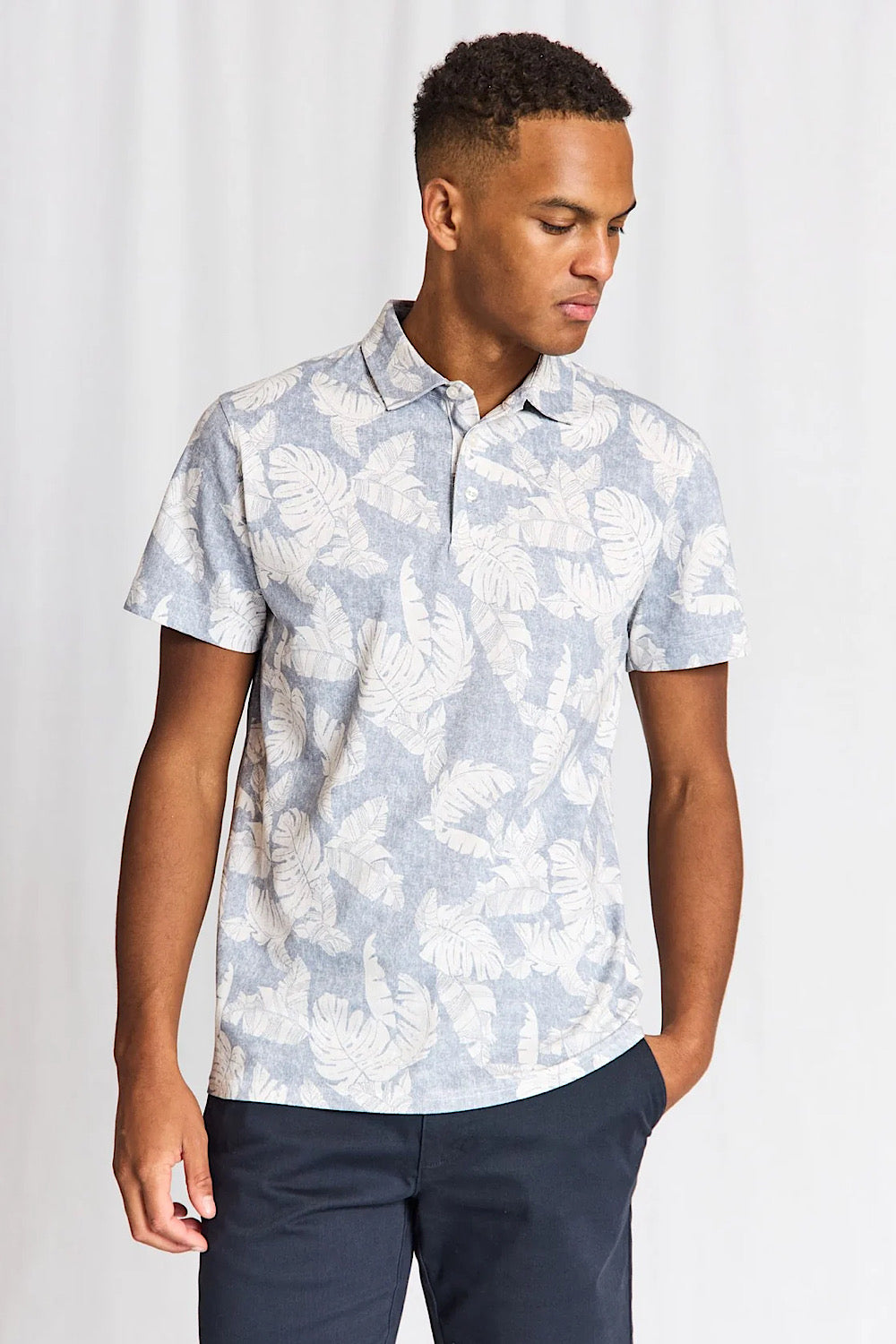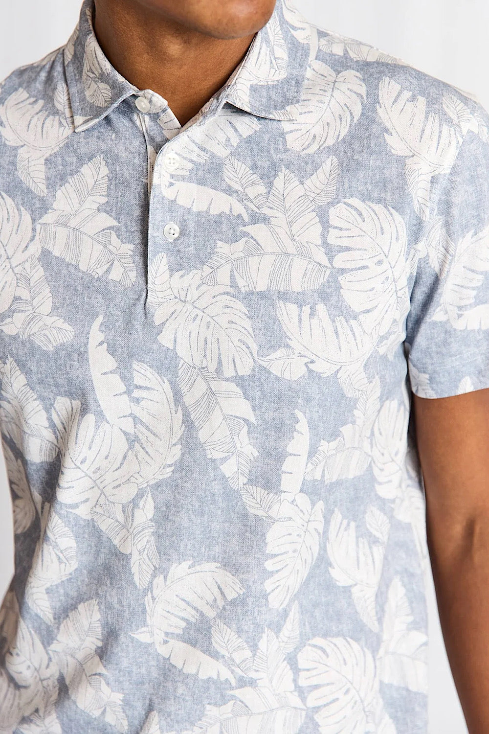 The Hydra Short Sleeve Polo in a dusty blue print is crafted from soft cotton pique, enhanced with 5% elastane for increased comfort and flexibility. Featuring a classic collar, French placket with pearl buttons, and a subtle print, this polo offers a timeless fit and contemporary style, suitable for various occasions.