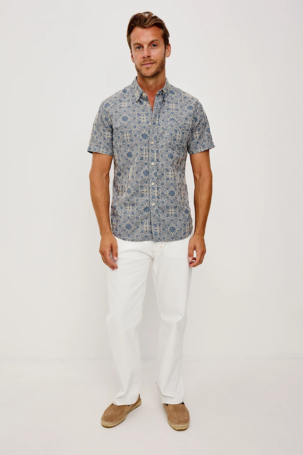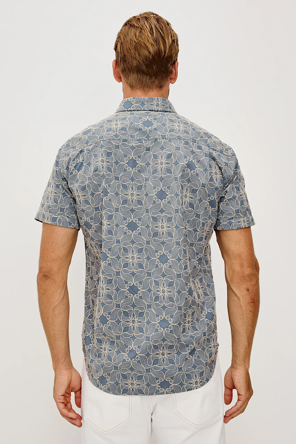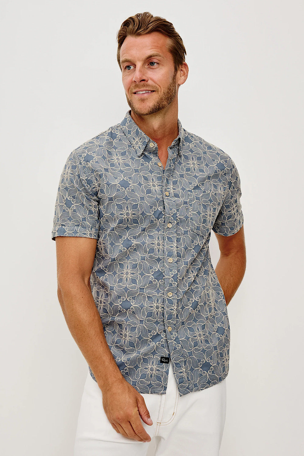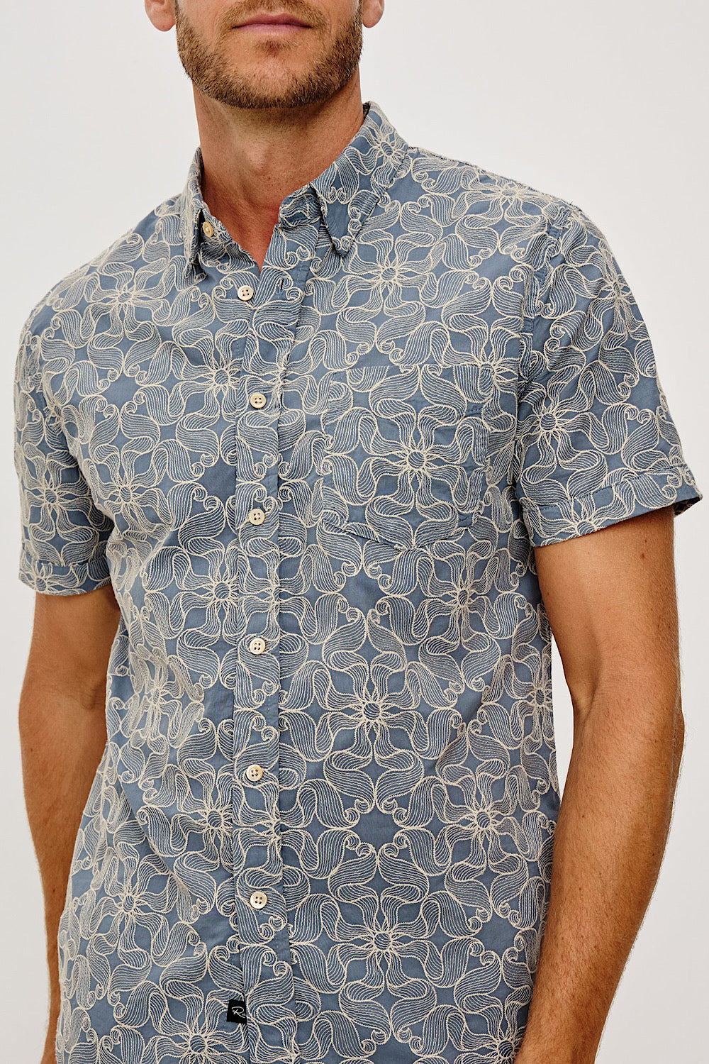 The Hale Short Sleeve Casual Shirt in Whirling Daisy Steel is constructed from soft, lightweight cotton, ensuring breathability and comfort. Its contrast floral embroidery adds a subtle visual interest, while the relaxed, tailored fit promotes ease of movement.