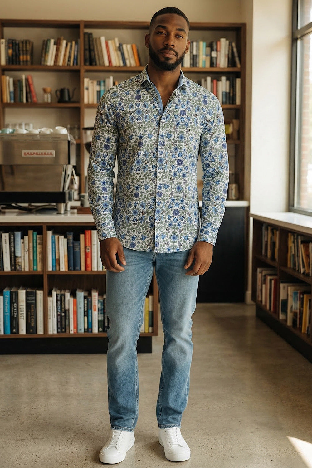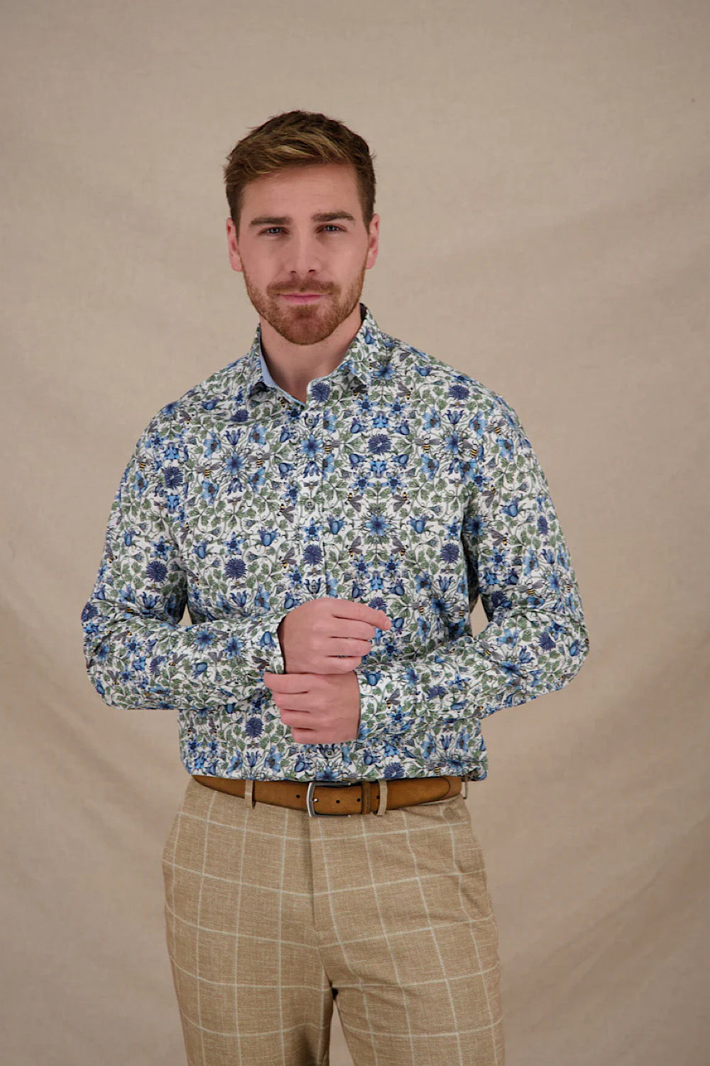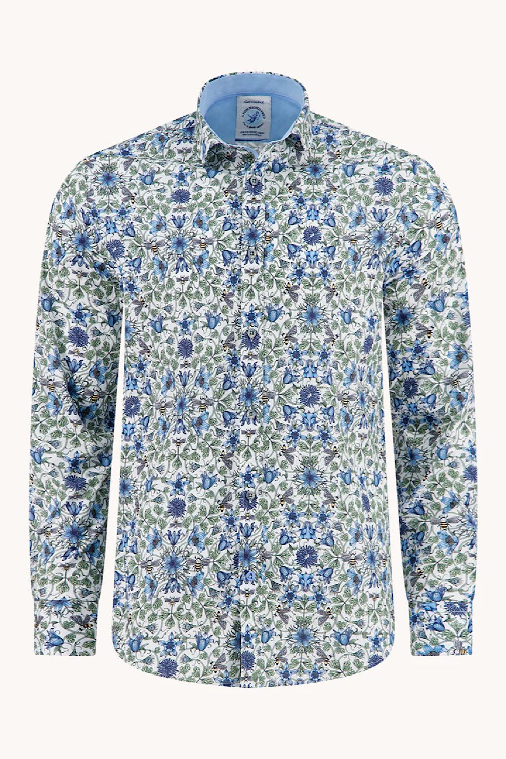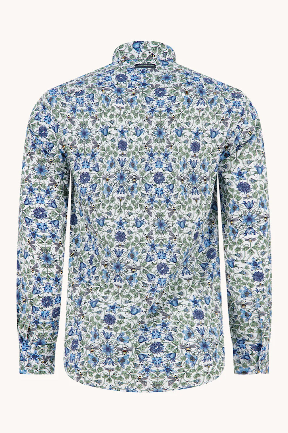 The Long Sleeve Casual Shirt in Art Nouveau Print features a regular fit and breathable cotton, ideal for summer wear and smart-casual occasions. Its design draws inspiration from the art nouveau movement, incorporating swirling lines and botanical motifs, including subtle bee accents, making it both stylish and cultured.