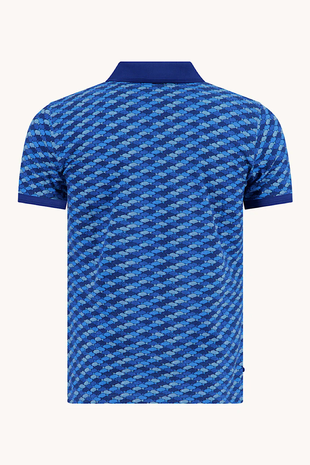This Polo in cobalt features a distinctive all-over graphic fish pattern, which enhances visual dynamism. The contrasting collar adds a sophisticated element, making it suitable for both casual and semi-formal occasions.