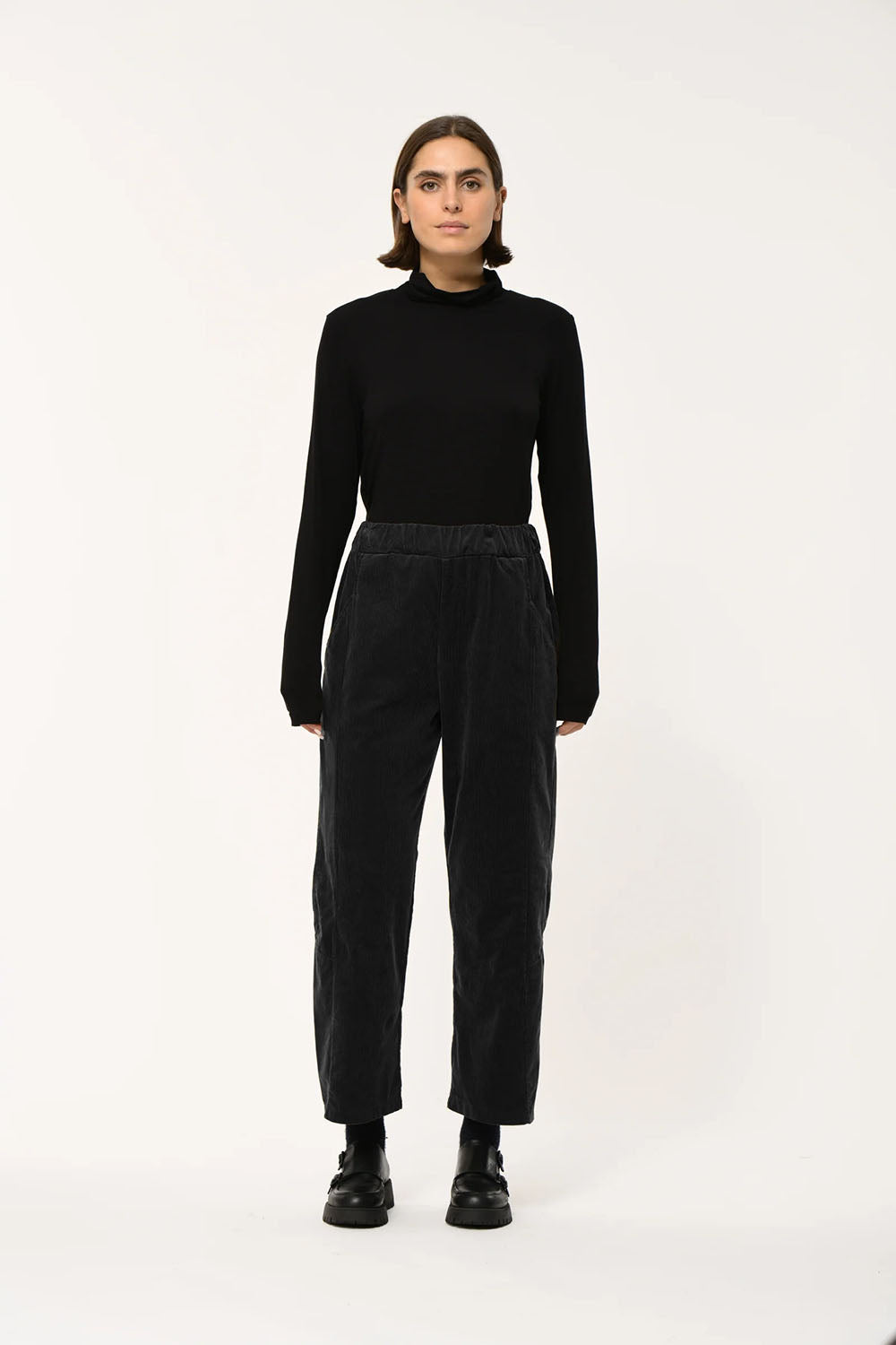 Experience refined comfort with the Komori Cord Pant, crafted from ribbed velvet for a soft, textured feel. Featuring a high elasticized waist, these pants provide a secure yet flexible fit, while the 7/8 length offers a modern, cropped silhouette. Practical slanted side pockets add convenience without compromising style.