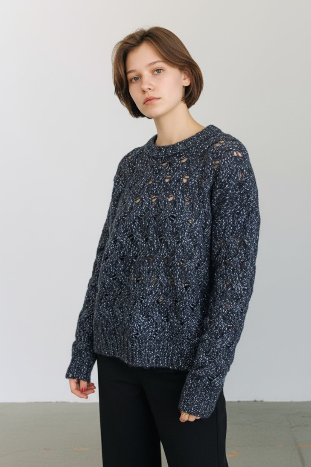 This Criss Cross Cable Crew Sweater features a loose knit design crafted from luxurious Italian novelty yarn. The textured cable pattern adds a sophisticated touch, while the breathable knit ensures comfort and versatility. Ideal for layering, this sweater combines expert craftsmanship with modern style.