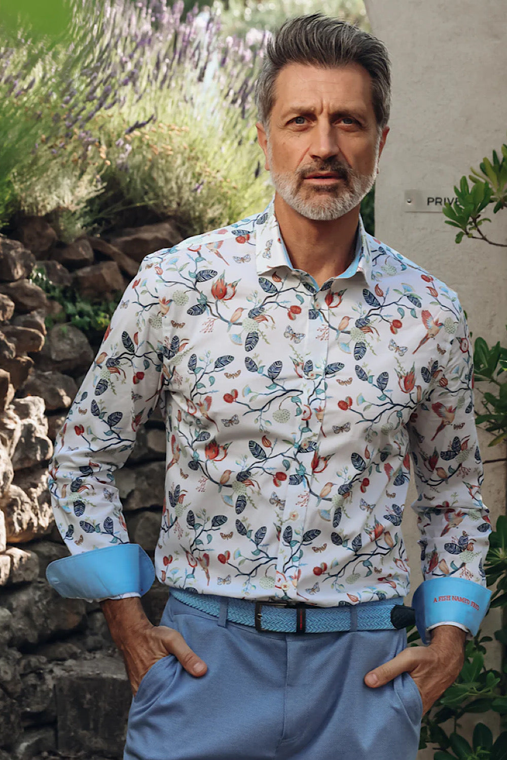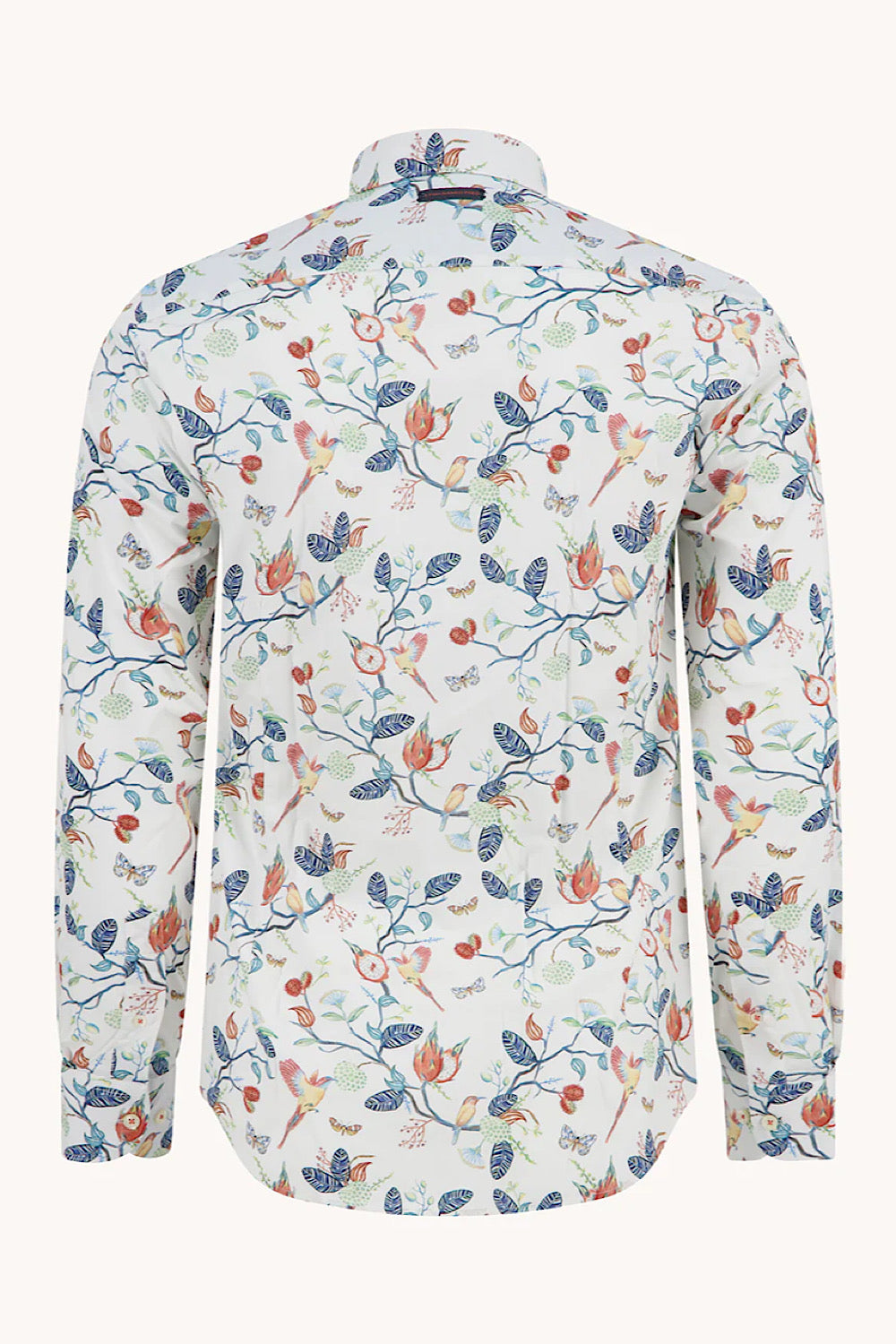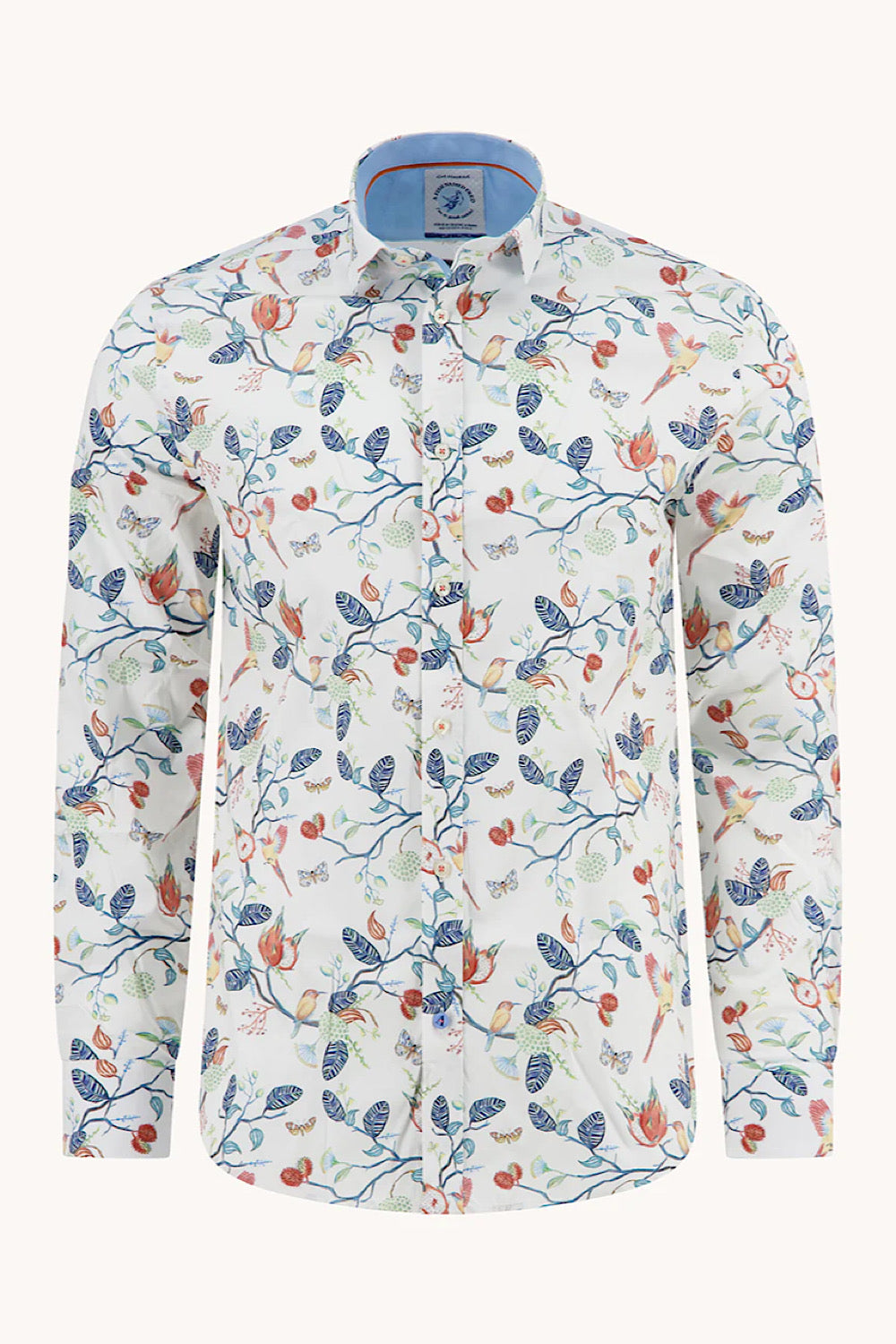 The Long Sleeve Casual Shirt in a colorful print features a vibrant all-over print of birds, butterflies, and blooms, crafted from breathable cotton for optimal comfort. The regular fit and contrast inner collar provide a stylish touch, while its variety of colors caters to different tastes and occasions. Ideal for casual outings.