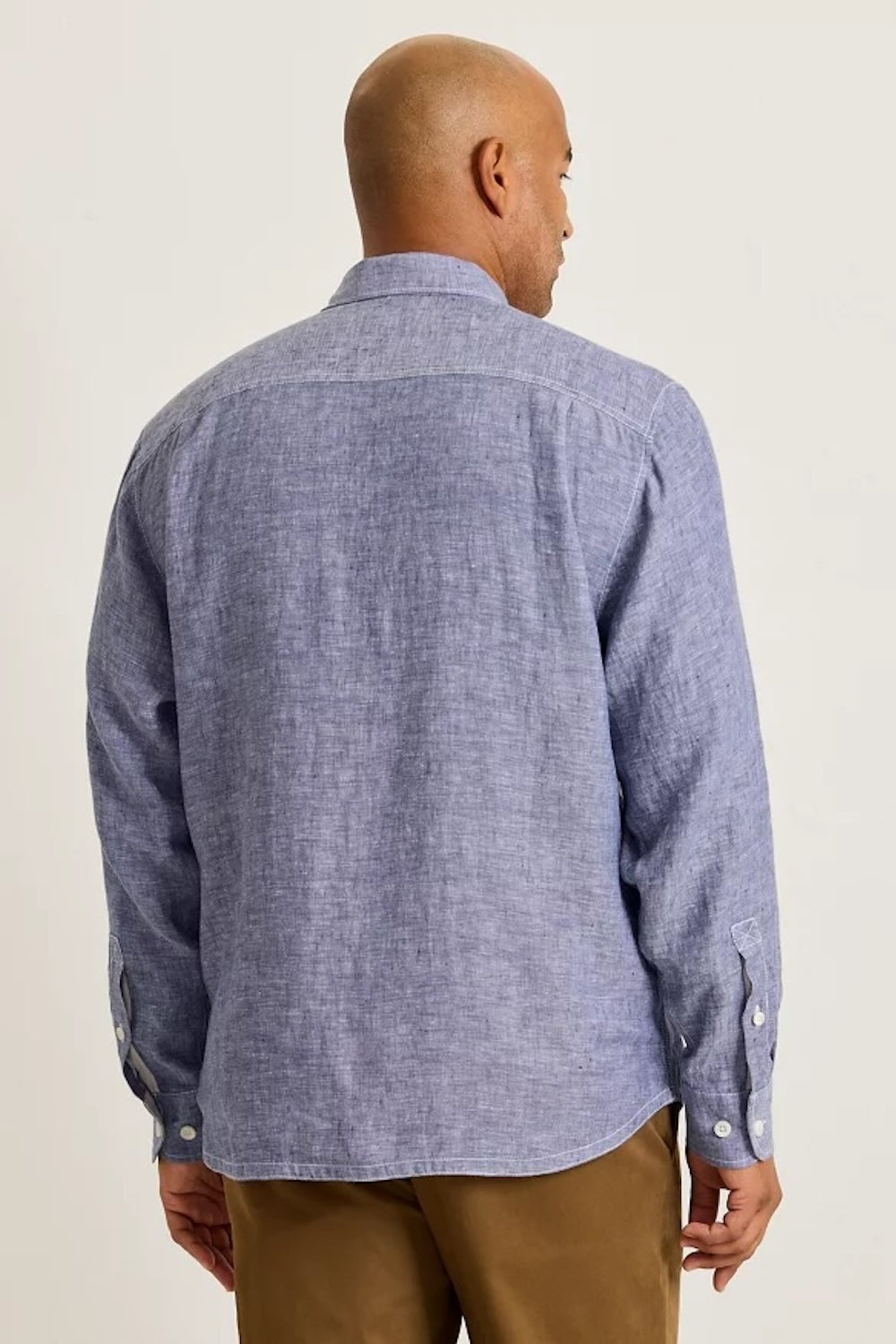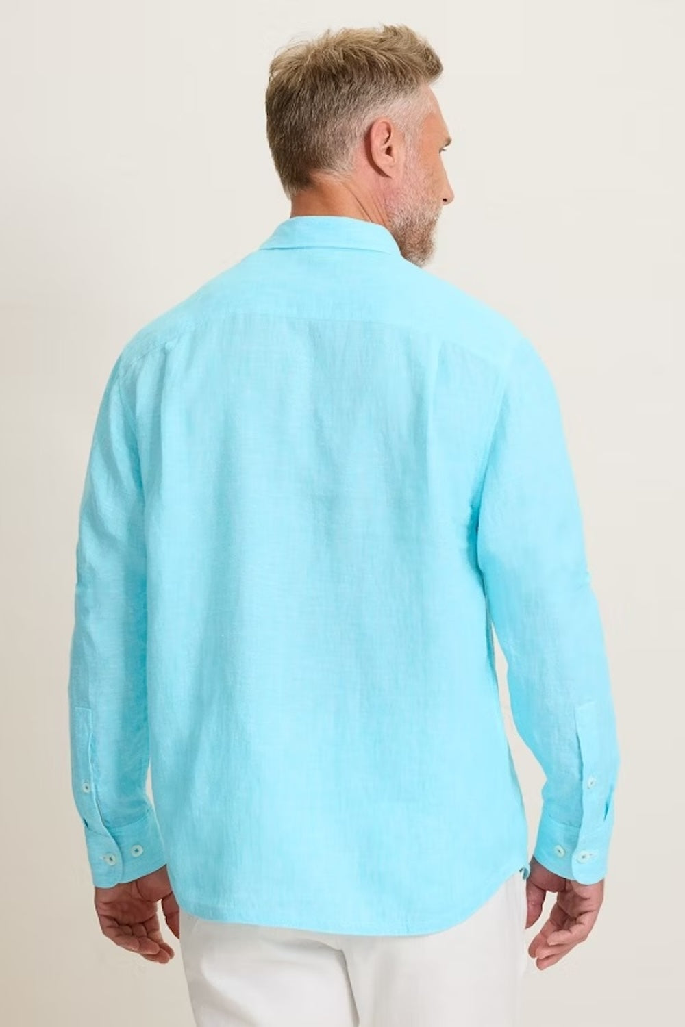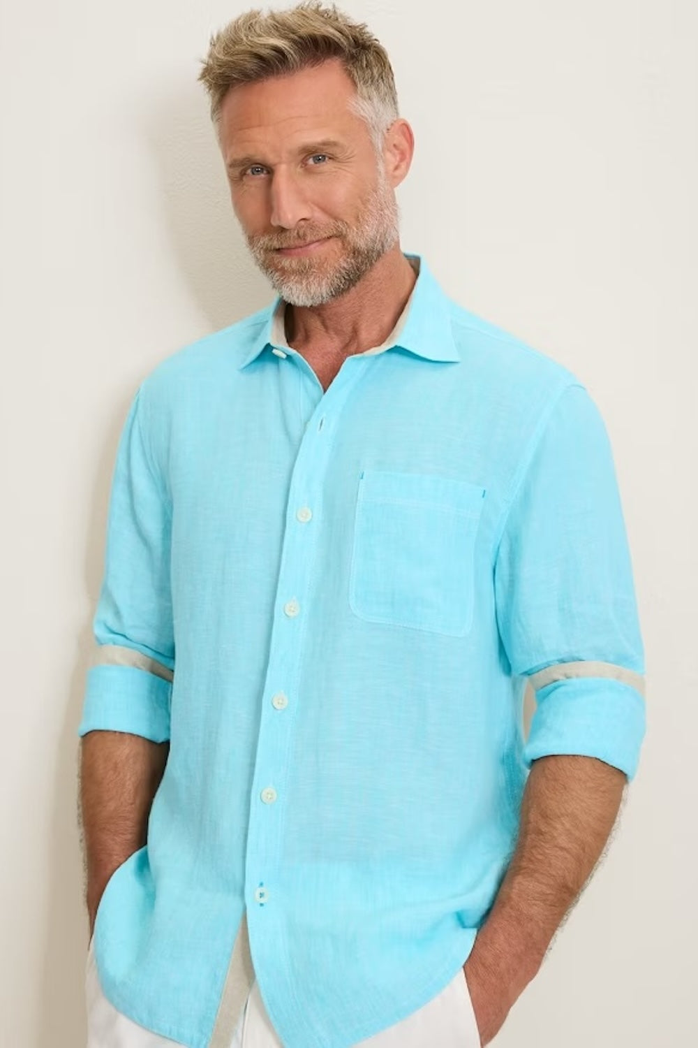 • 100% Linen • Two-piece stand collar • Rounded patch chest pocket • Shirttail hem • Embroidered Marlin logo at the hem • Care according to label instructions