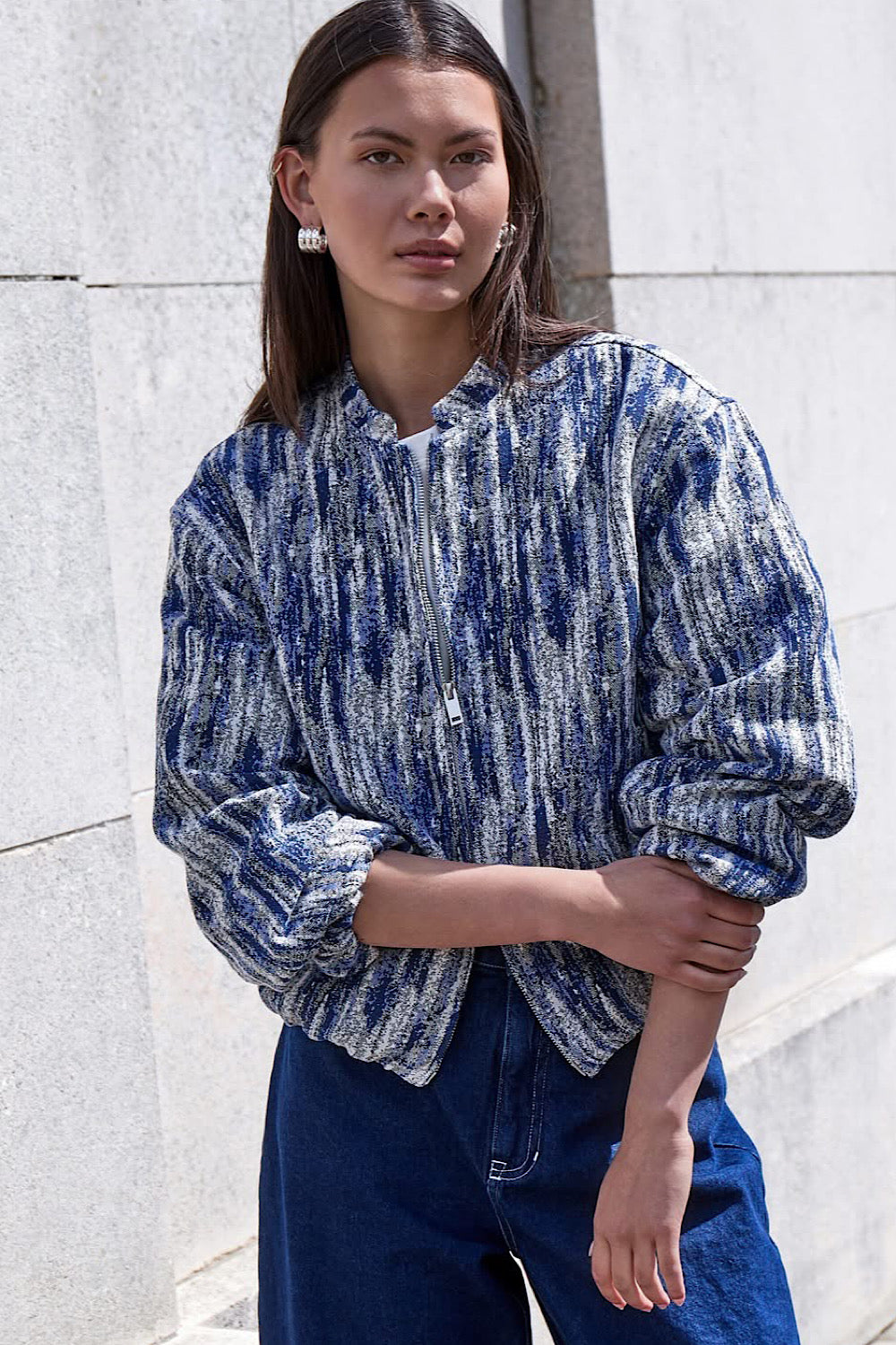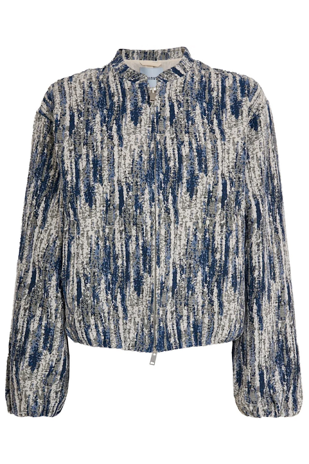The Bessa Short Coat features a women's bomber style design with a unique blue cream pattern and a practical zipper front.