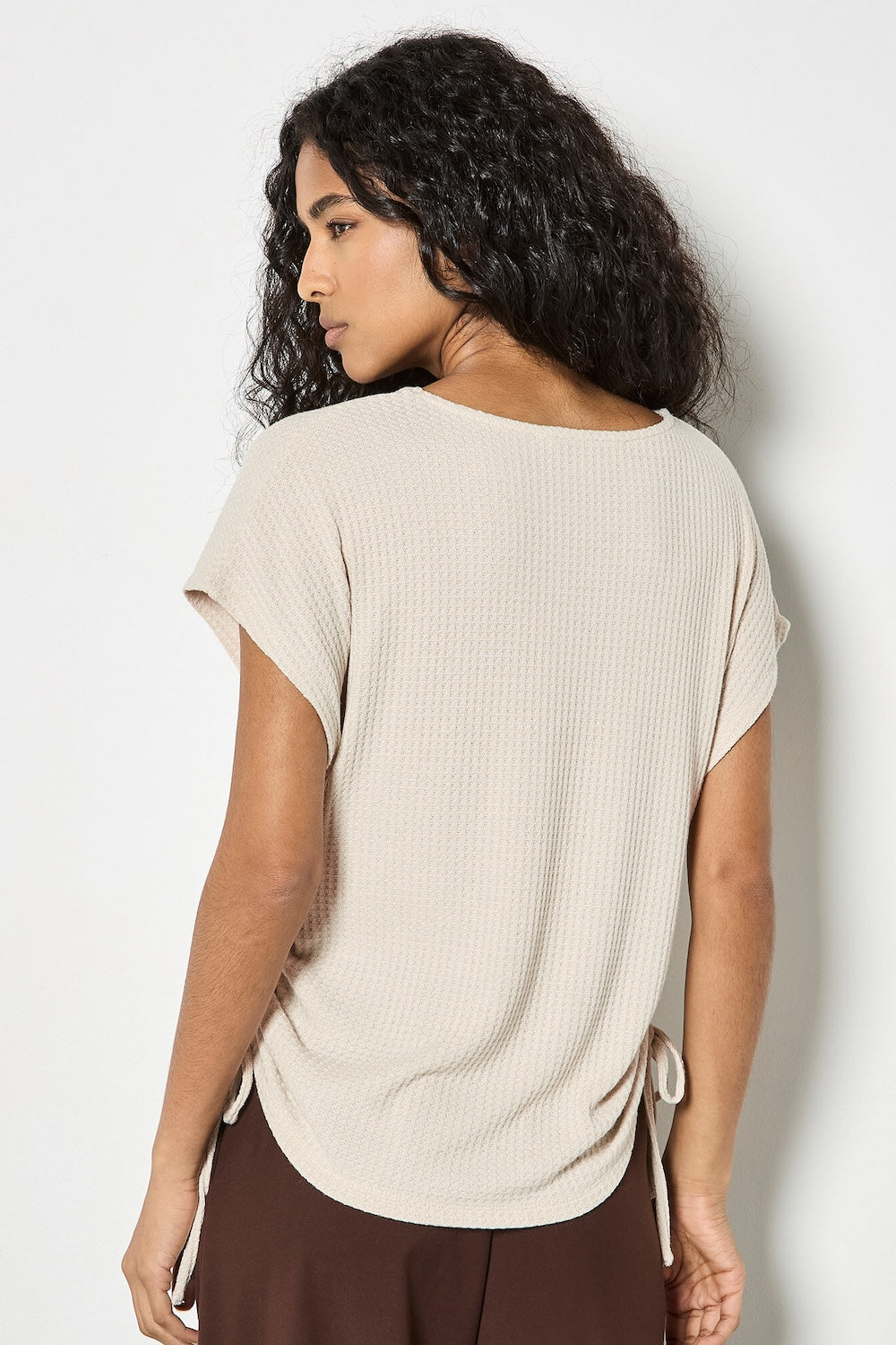 The Summer Waffle Side Ruched Tee combines comfort with contemporary style. Crafted in a lightweight waffle fabric, this tee features a classic crew neck and short sleeves for everyday versatility. Adjustable drawstring ties at the ruched sides let you customize the fit to flatter your frame.