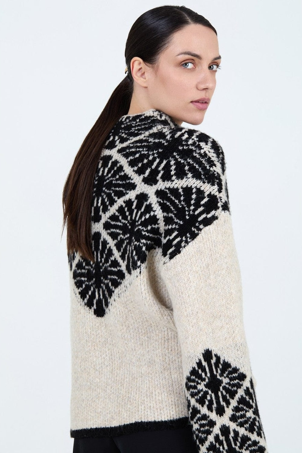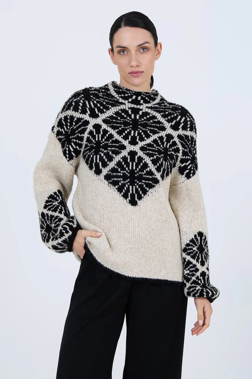 This wool blend sweater combines warmth with style, featuring a graceful cowl neck and elegant puffed sleeves that add a touch of drama. The jacquard geometric print offers a refined pattern that elevates any outfit.