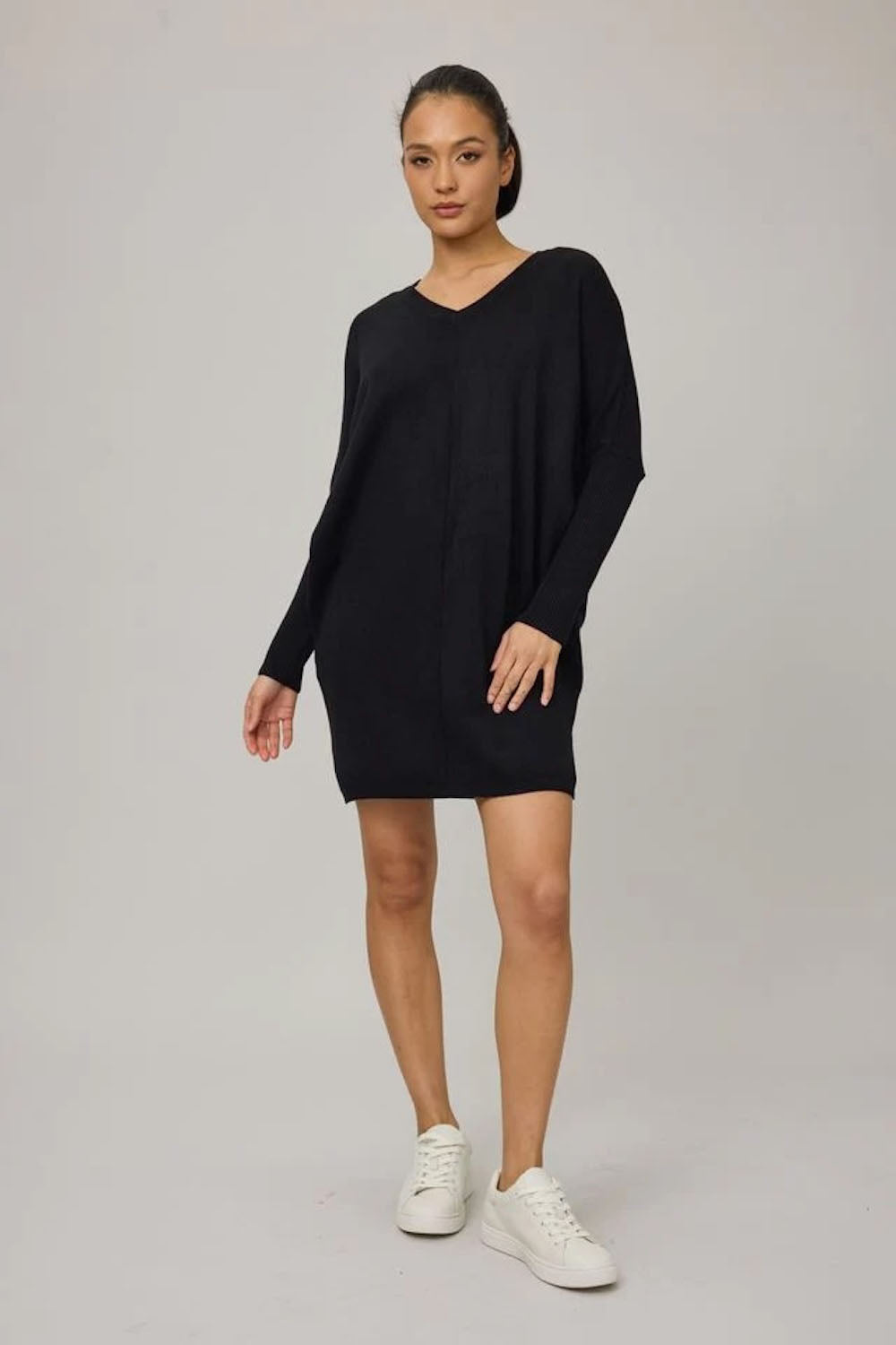 This knit dress features elegant ribbed long sleeves and a flattering V-neckline, offering both comfort and a refined silhouette.