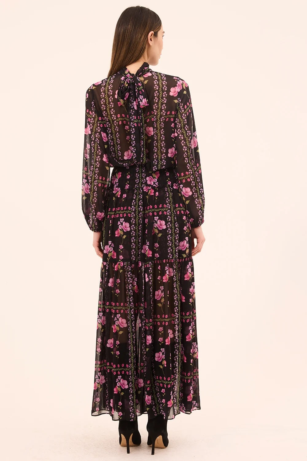 The Lulu top is a dreamy high-neck silhouette cut from chic Midnight Lattice printed chiffon. Featuring a tie-back keyhole closure and long sleeves with elastic cuffs, this elegant style has sheer sleeves and a double-lined bodice for perfect coverage.