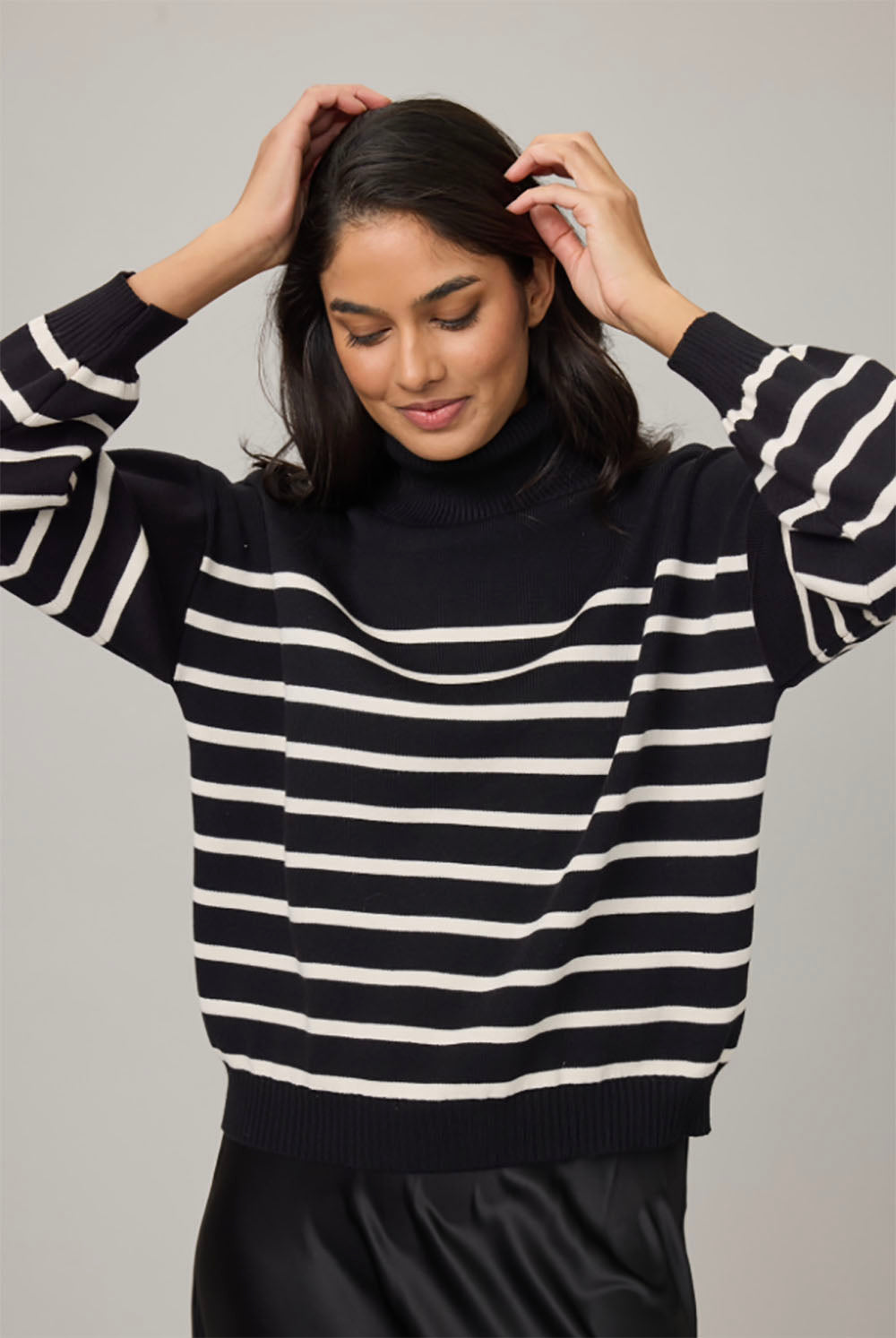 The classic horizontal stripes add visual interest while the cozy turtleneck provides warmth and a polished silhouette. This versatile piece layers effortlessly over basics or stands alone as a statement piece.