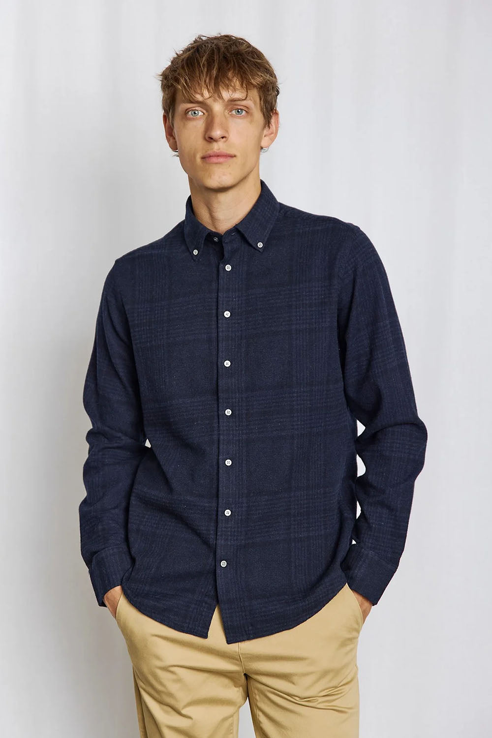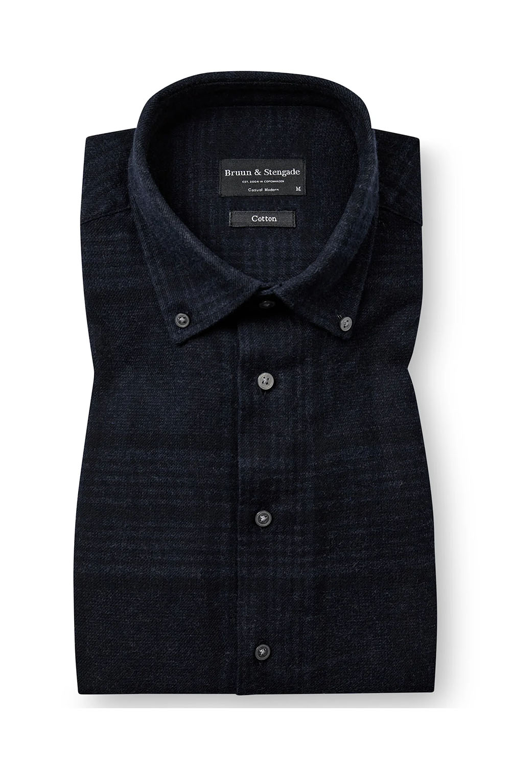 Experience comfort and style with the Akhlaq Long Sleeve Casual Shirt in Thunder. Crafted from soft cotton with a brushed surface, this modern fit shirt offers a smooth, cozy feel. Its button-down collar and French placket with subtle grey buttons add refined detail, while adjustable cuffs ensure a perfect fit.