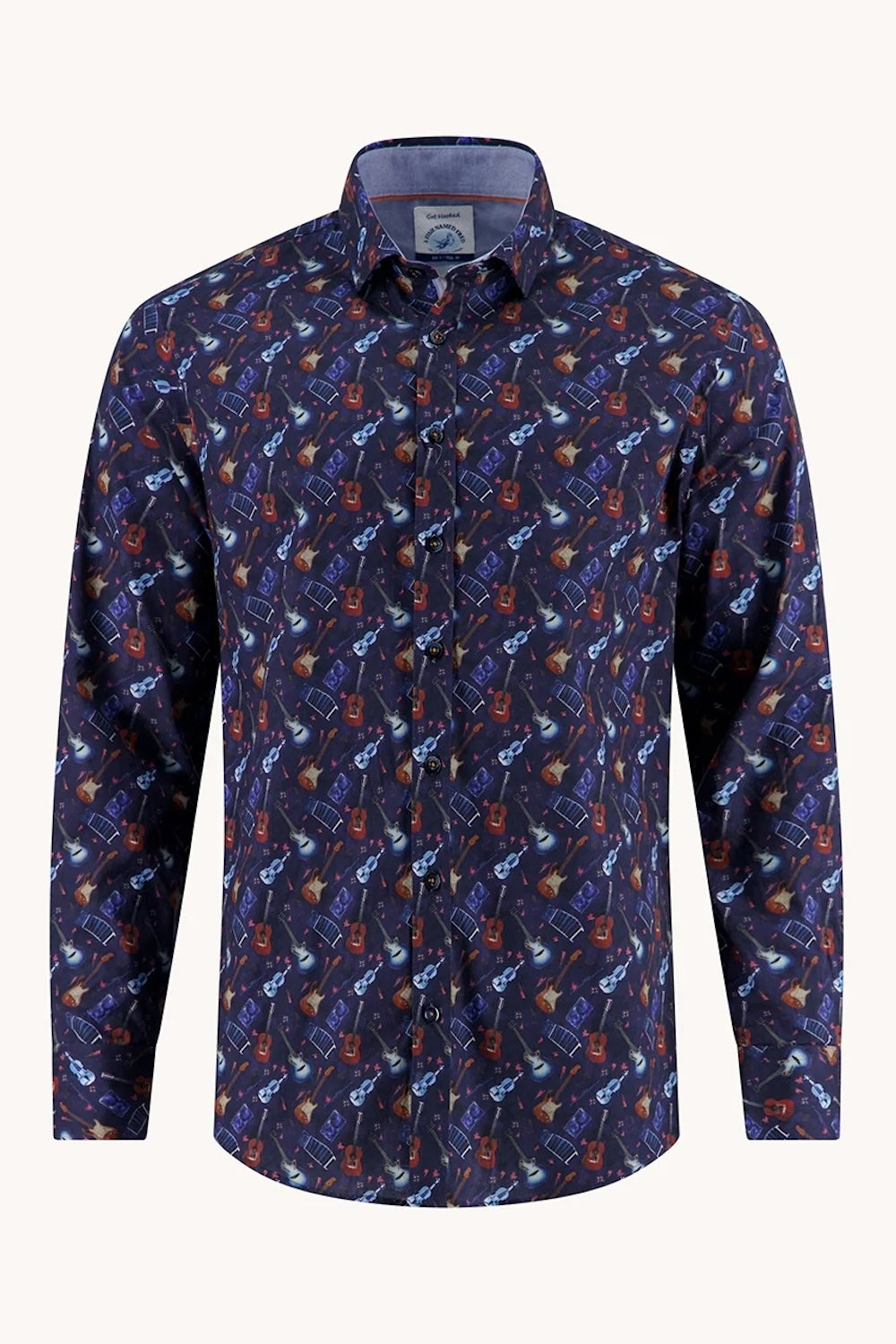 Make a bold statement with the Long Sleeve Casual Shirt in Navy Guitar Print. This shirt blends a comfortable, relaxed fit with a unique guitar motif, perfect for showcasing your passion for music. Its versatile style works seamlessly from casual days to creative nights, ensuring you stand out with effortless cool.