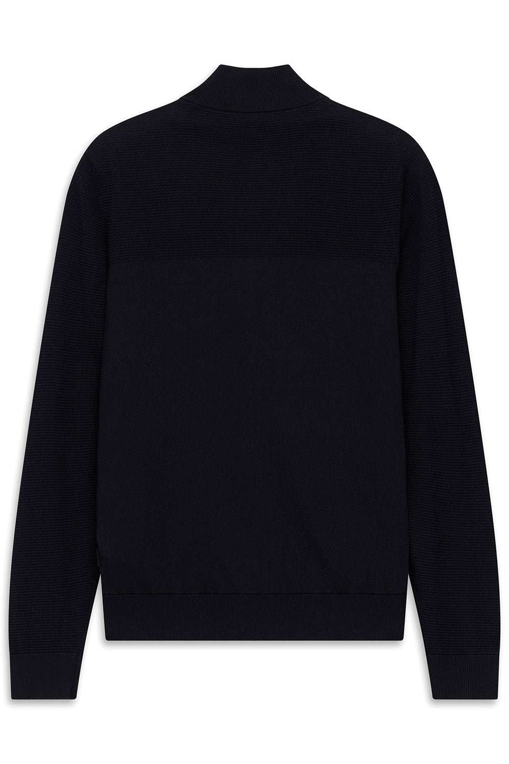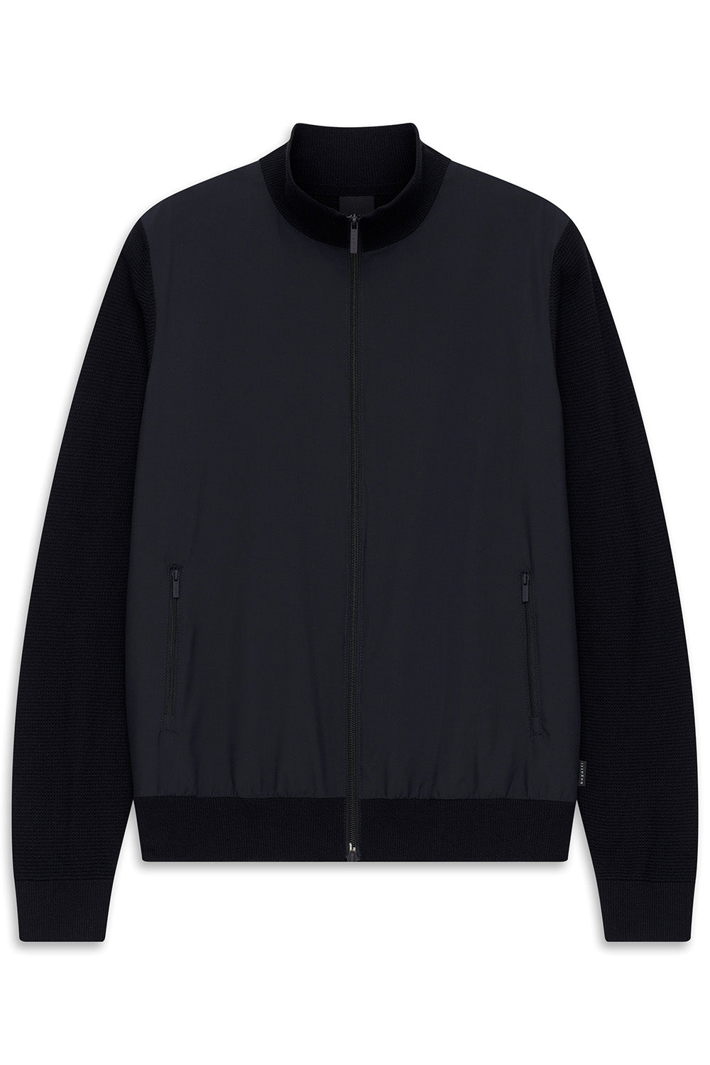 A versatile bomber-style coat designed for everyday wear and active pursuits. Features a classic full-zip silhouette with a cozy knit collar for added warmth and comfort. The front showcases performance fabric that resists moisture and wear, while the sleeves are crafted from soft knit material for flexibility and ease of movement. The navy colorway pairs effortlessly with any wardrobe.