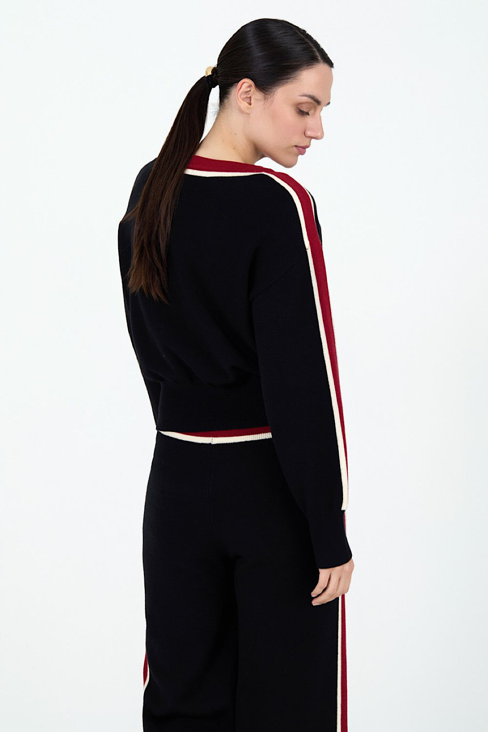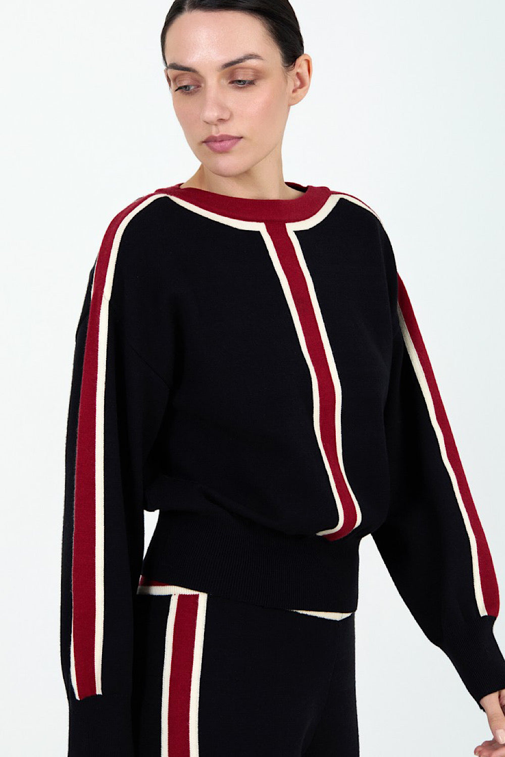 Featuring a contrasting intarsia stripe at the collar, sleeve and front chest, this sweater will elevate any outfit.