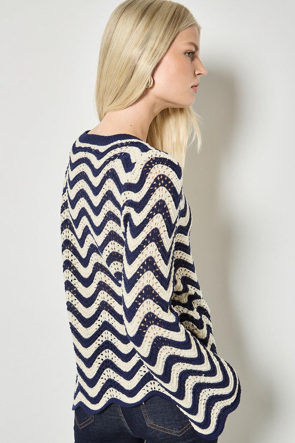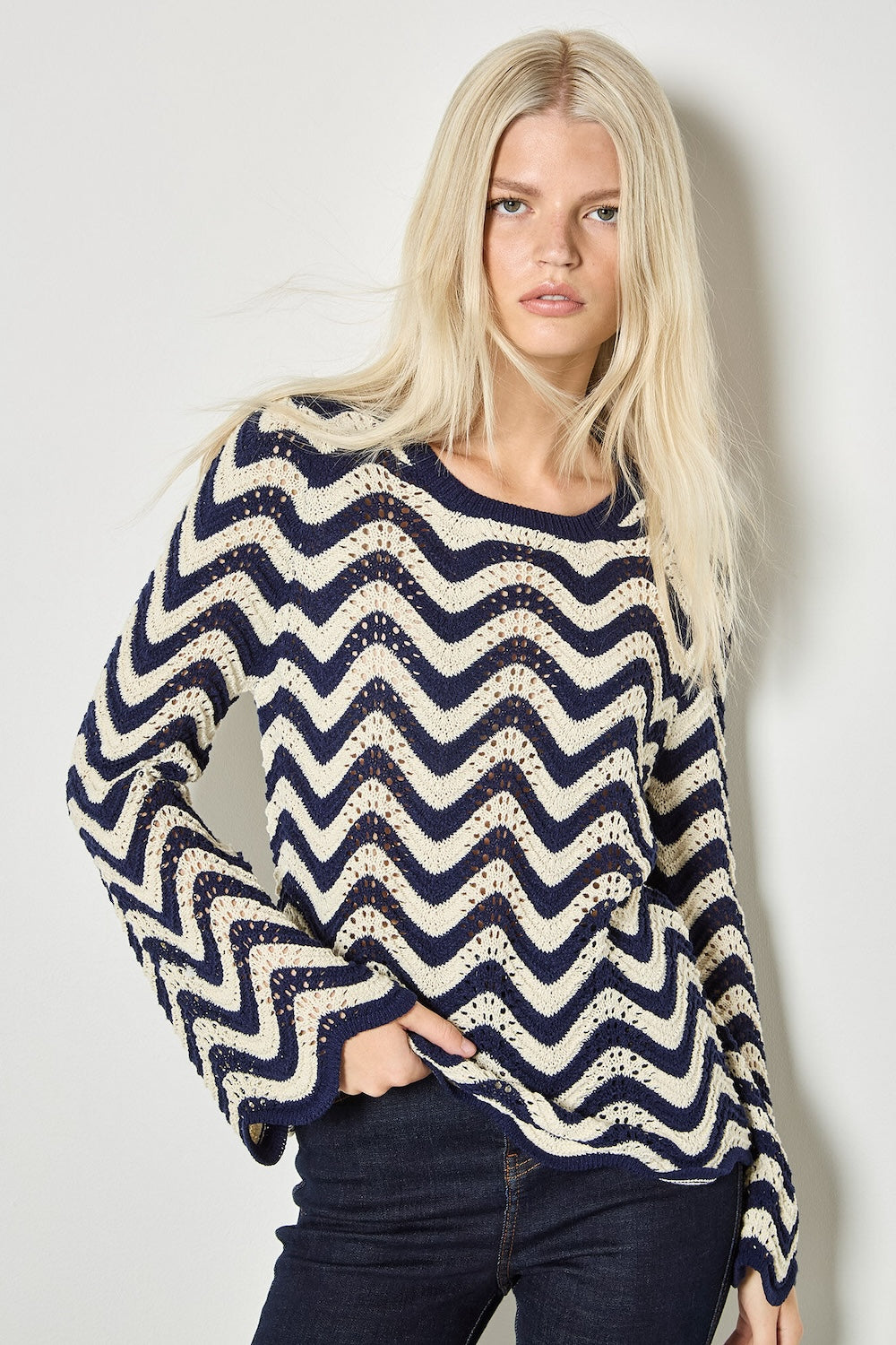 Crafted from a breathable mid-weight pointelle knit, this sweater brings effortless elegance to your closet. Bell sleeves frame the arms with gentle movement, while the classic crew neckline keeps the look refined. A scalloped hem provides a charming detail that catches the eye. Versatile enough for layering or standalone wear, it's a wardrobe essential that works across seasons.