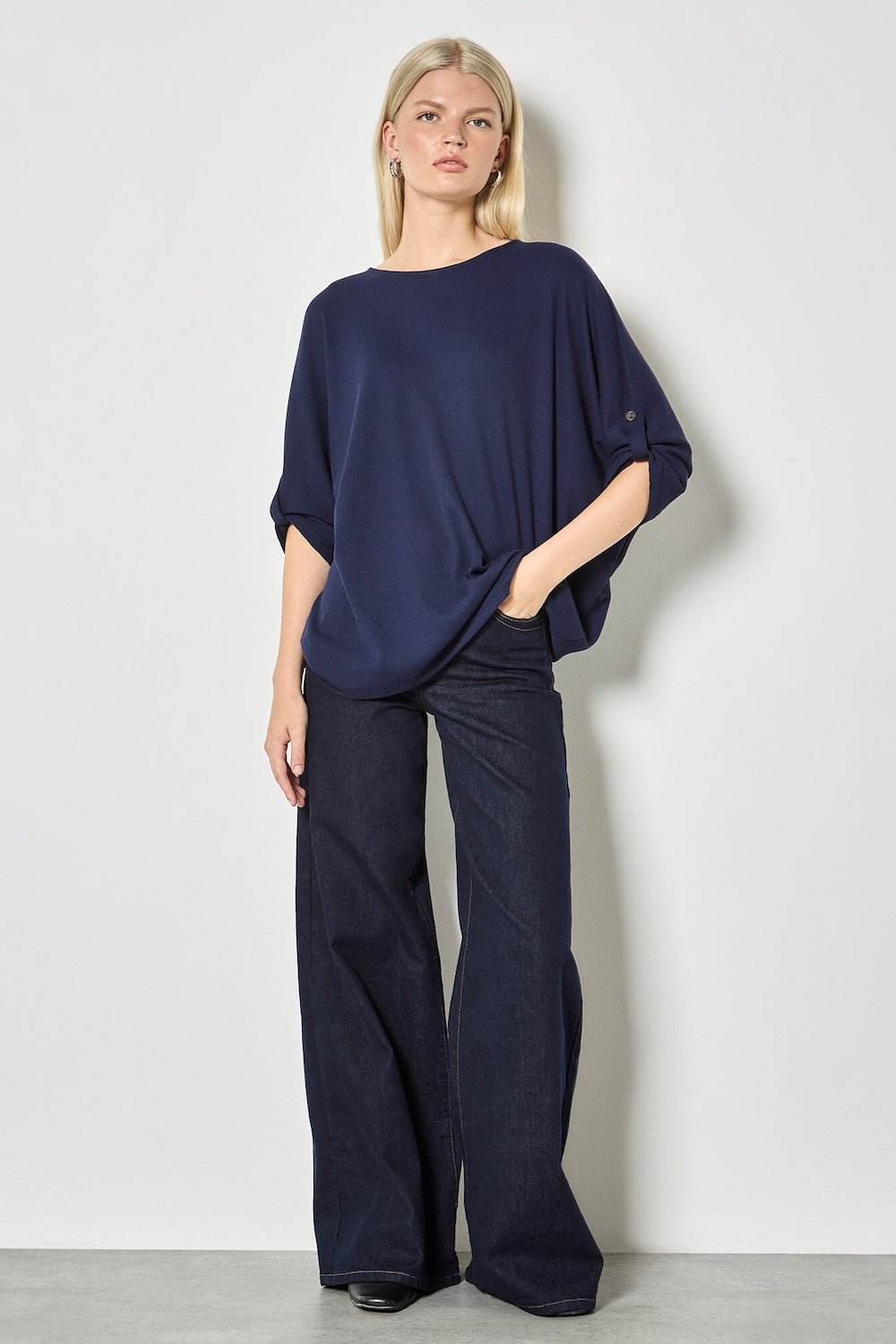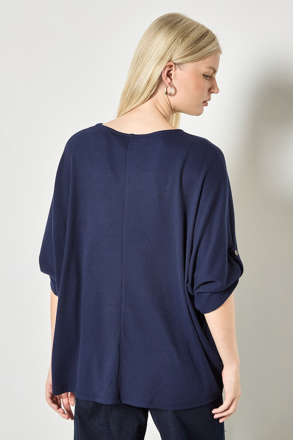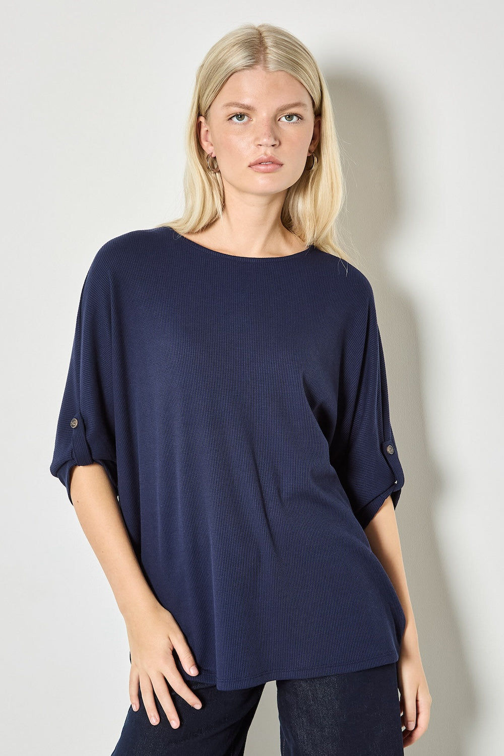 Discover understated sophistication with this waffle knit essential. The breathable fabric keeps you comfortable all day, while the relaxed fit and boat neckline offer a flattering, laid-back look. Button-accented rolled sleeves and lightweight construction make it the perfect layering piece for any casual wardrobe.