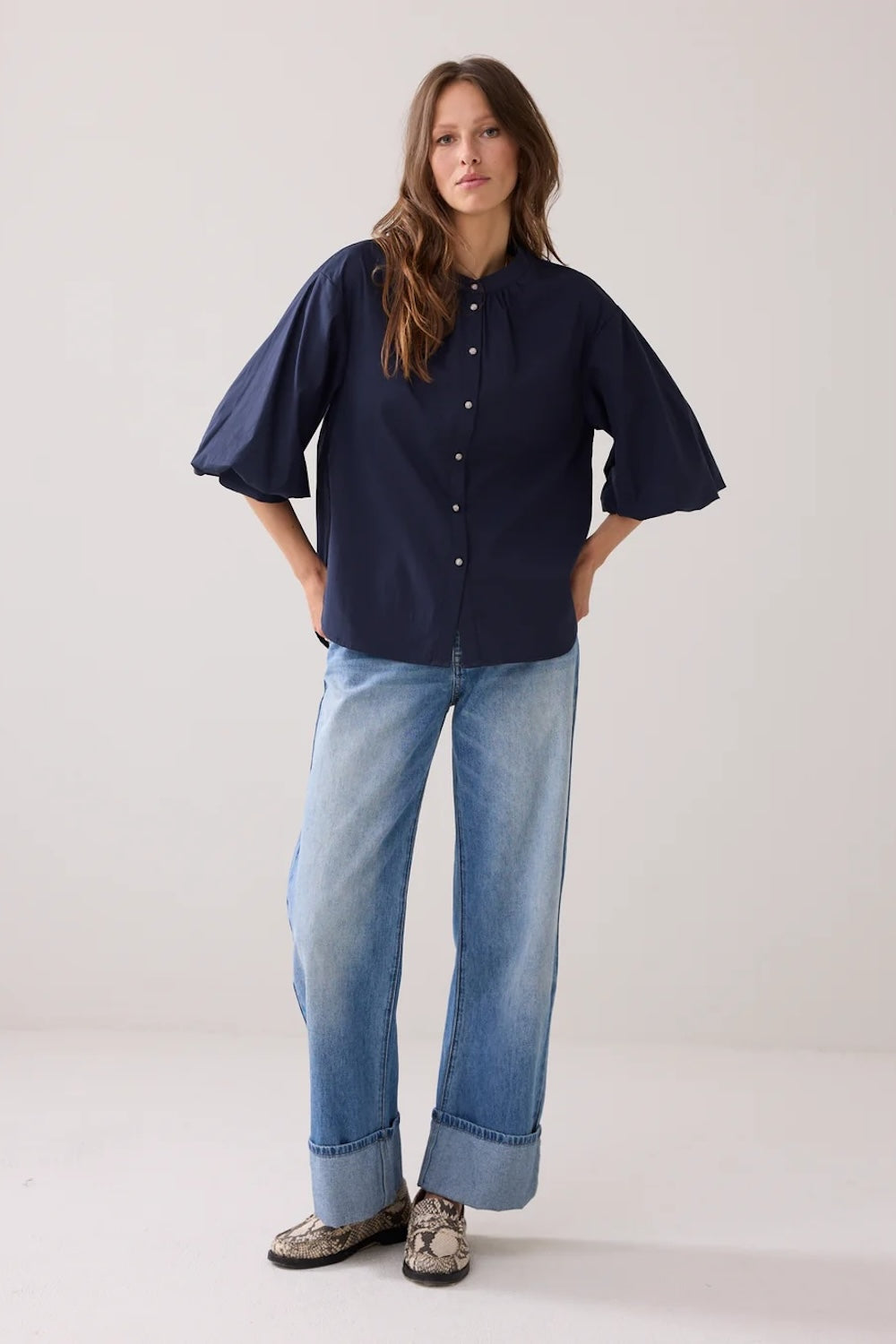 This Midnight Blue Cotton Stretch Blouse combines timeless style with modern details. Shiny diamond buttons catch the light for a refined touch, while the round neckline and puffed sleeves add a feminine flair. Designed with a straight fit, it offers both comfort and a sleek look, making it an essential piece for effortlessly chic outfits.